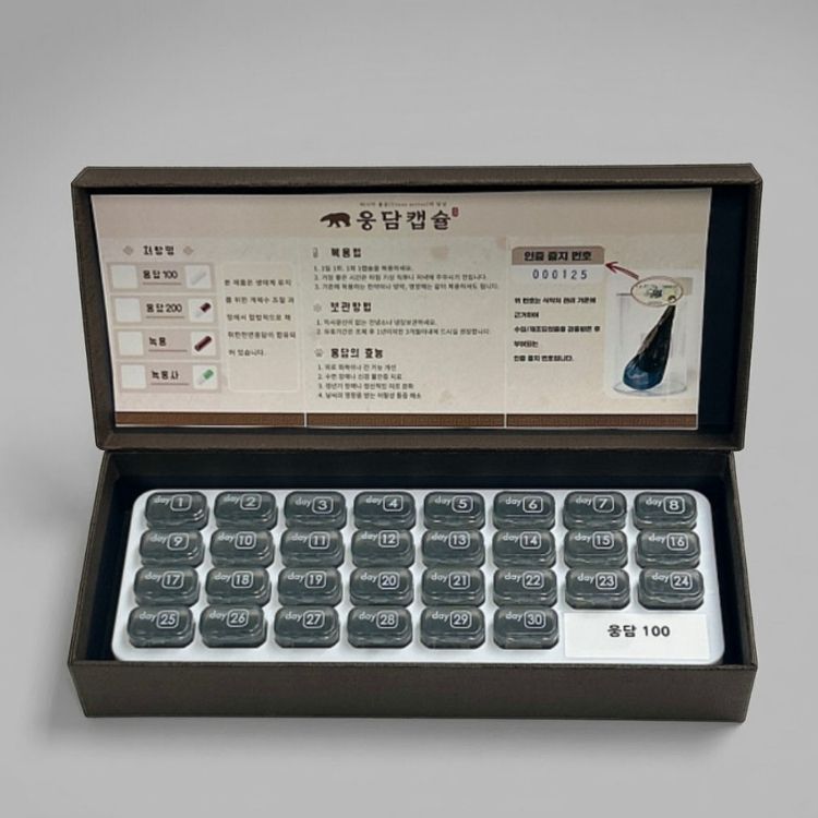 웅담(熊膽)의 우수한 간세포 회복력으로 간기능 저하로 인한 피로, 무기력개선을 돕는 자양강장약 입니다. 실제 러시아 야생곰의 개체수 조절을 위해 합법적으로 채취한 정품 A급 천연웅담을 사용합니다.